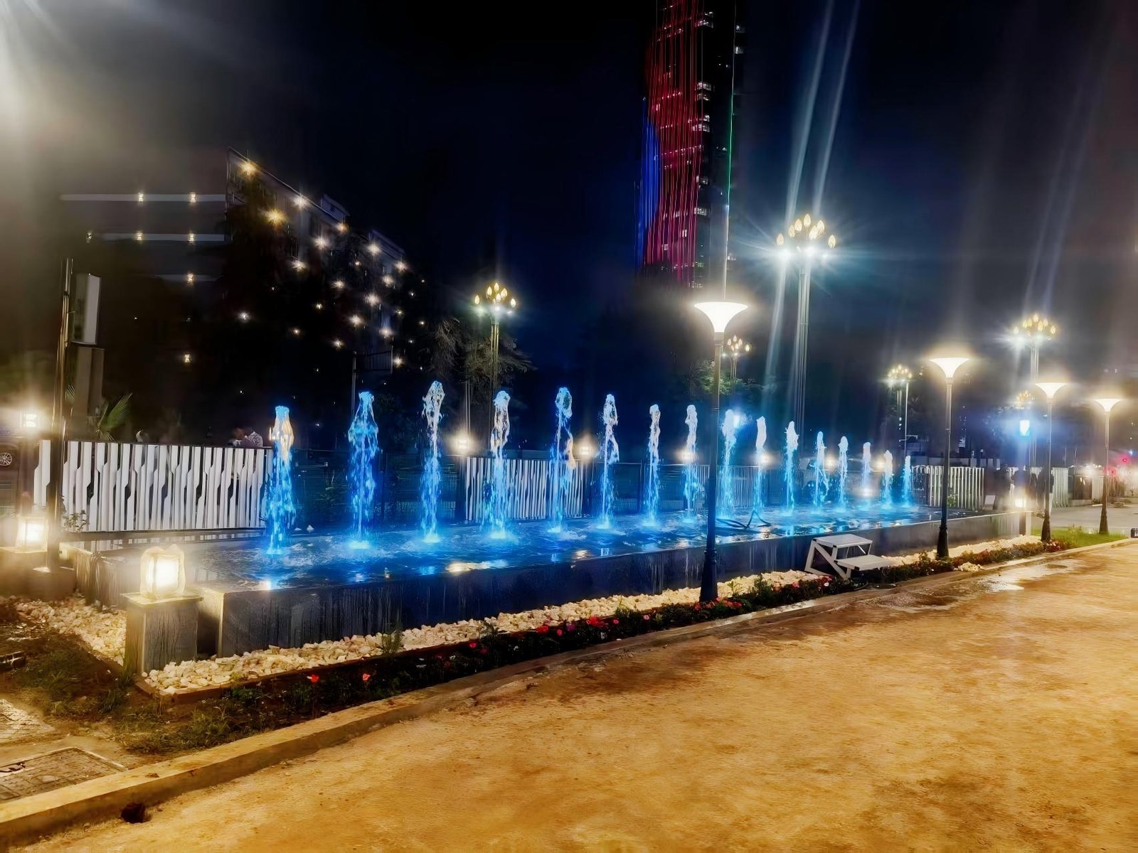 Este proyecto de fuente musical en Etiopía, diseñado e instalado por Changsha Himalaya Music Fountain, consta de dos estanques equipados con un total de 32 conjuntos de sistemas de fuentes oscilantes con variador de frecuencia (VFD).